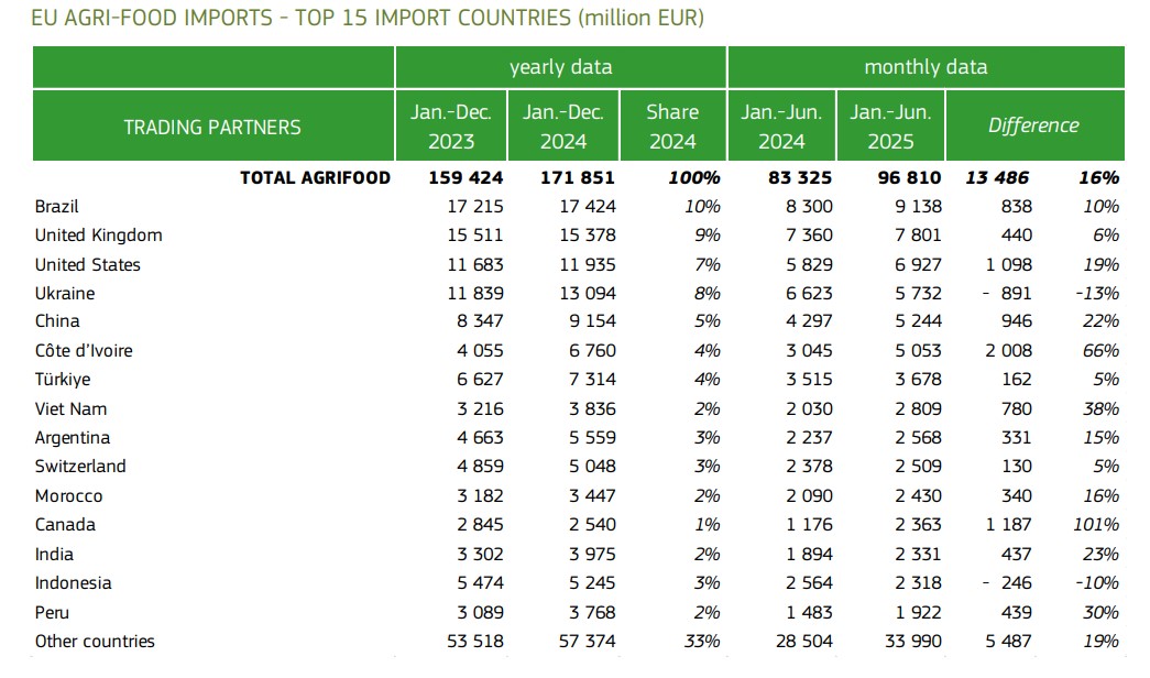 Overall, EU agricultural imports from January to July 2025 totaled $96.8 billion (+16%), while the EU’s agricultural exports reached $118.7 billion (+2%), with $2.1 billion going to Ukraine (+17%).